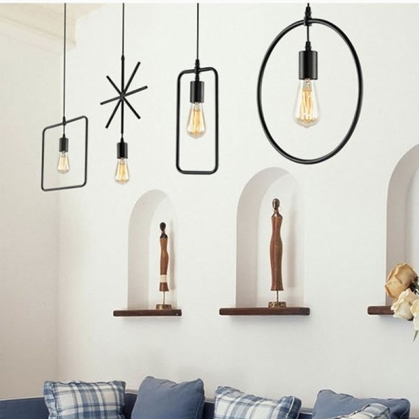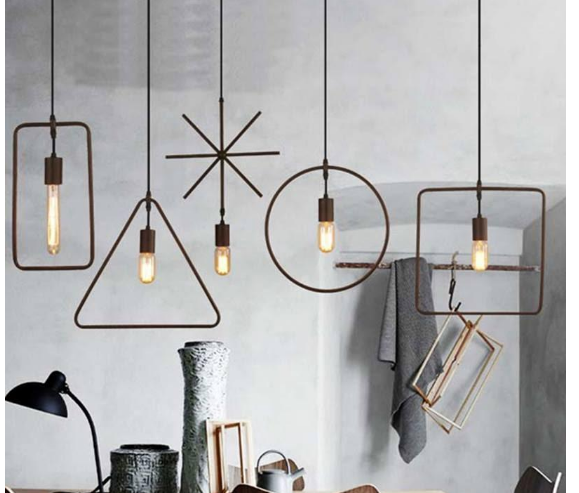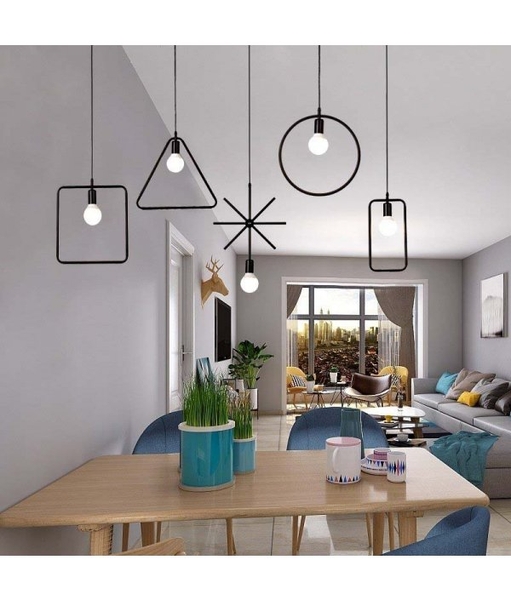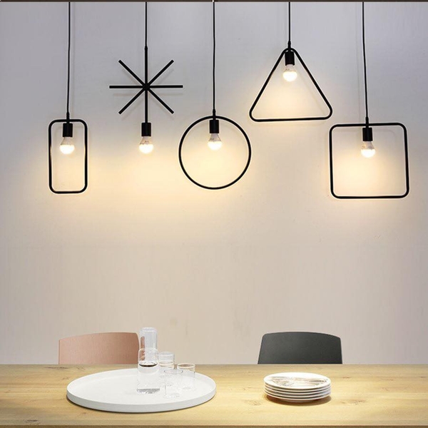 Khi bạn sử dụng các loại đèn thả hình học theo cụm với đầy đủ các hình vuông, tròn, tam giác... bằng chất liệu sắt sẽ mang đến một cảm giác nổi loạn, bụi bặm, rất thích hợp với các shop thời trang nam hoặc những shop có style cool ngầu, bụi bụi...