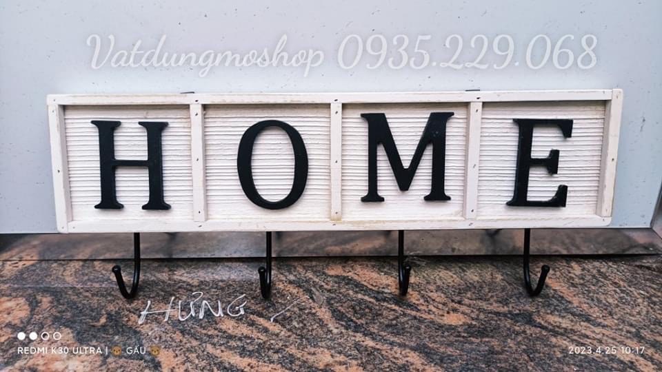 Chiếc bảng Home được làm từ gỗ, vừa có thể treo đồ, treo phụ kiện với 4 móc treo vô cùng tiện dụng.