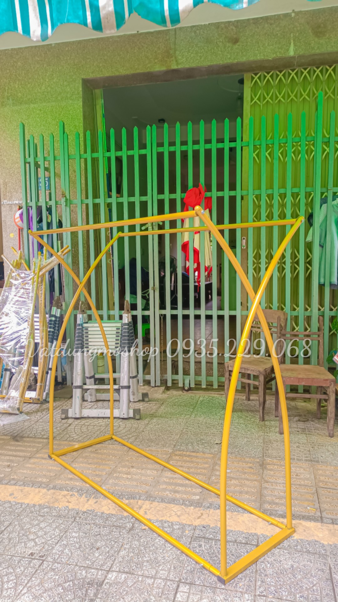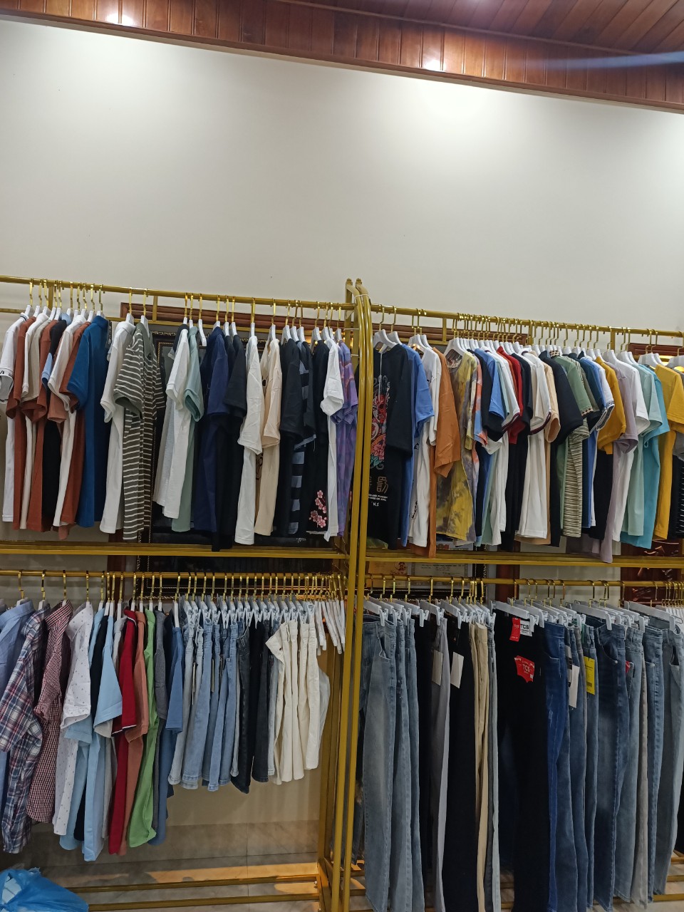 - Kệ chữ Y 2 tầng: Kệ cao 1m8 dài 1m2, kệ có độ cao vừa đủ dùng cho cả shop trẻ em và người lớn đều vô cùng nổi bật, kệ được phủ một lớp sơn vàng đồng tinh tế. Kệ được đặt hai bên sát tường, treo đồ ở 2 tầng vừa tiết kiệm diện tích vừa tiết kiệm chi phí. Không những thế, kệ lắp ráp nên dễ dàng tháo rời và vận chuyển đi nhiều nơi cực kì tiện lợi.